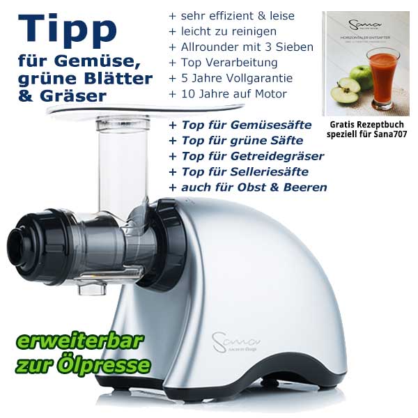 Tipp: Sana Juicer 707 ist ein absoluter Spezialist für langfaseriges Pressgut wie z.B. Weizengras, Stangensellerie, Wildkräuter, grüne Blätter und hartes Pressgut wie Karotten & Rüben. Mit diesem Gerät lassen sich sich nicht nur hochwertige Säfte herstellen, denn neben Entsaften kann der Sana Juicer 707 auch Zerkleinern, Pürieren und Mahlen. Da es neben dem feinen und groben Sieb, noch ein Blanksieb im Lieferumfang gibt, lassen sich auch Nudeln, wie Spaghetti oder Bandnudeln herstellen. Des Weiteren können Sie Eiscreme, Sorbet oder Nussbutter herstellen oder Kaffee mahlen. Dank des umfangreichen Zubehörs, haben Sie eine große Vielfalt an Möglichkeiten. Eines der weiteren Highlights, ist die nachrüstbare Ölpresse, mit der Sie kaltgepresste Öle in Rohkostqualität herstellen können.