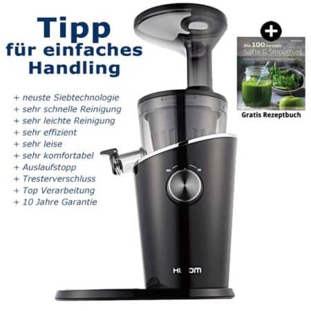 Der Entsafter ist toll! Saft- Ausbeute ist sehr gut, das Gerät arbeitet sehr leise, das Zusammenbauen geht schnell und kinderleicht. Die Reinigung ist ganz einfach. Ich finde den Sieb, den man auf den Saftbehälter draufgeben kann super praktisch – so wird der Schaum und ev. Mini-Reste aufgefangen.