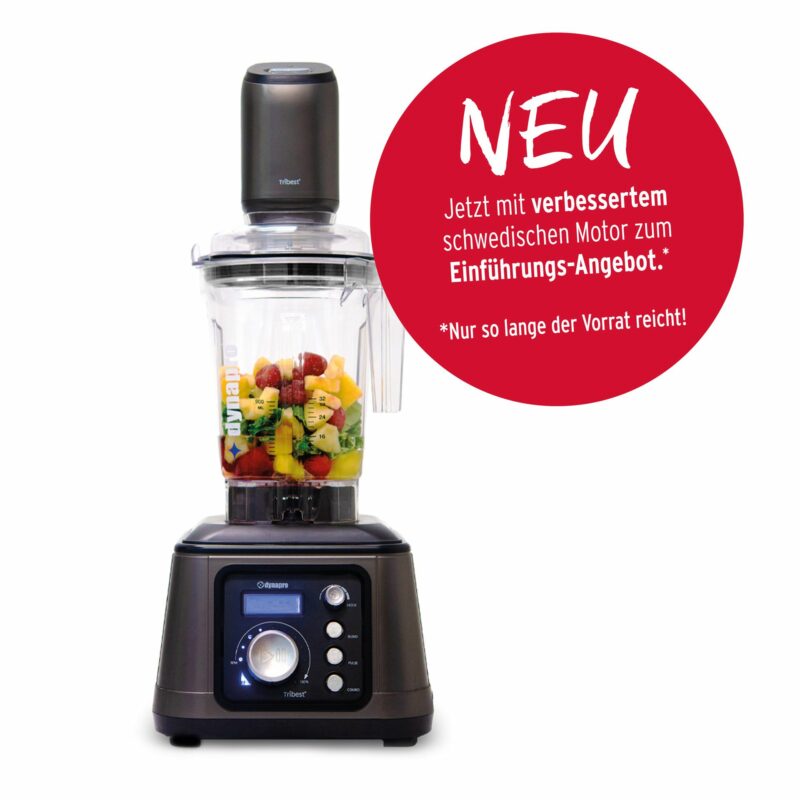 Der erste Hochleistungsmixer von Tribest mit einer Leistung von 2,5 PS ist darauf konzipiert, höchste Nährstoffqualität zu liefern und Sauerstoffeintrag zu vermeiden. Dieses Modell ist die hochwertige Premiumausgabe des Dynapro, denn dieser Hochleistungsmixer wurde mit einem hochwertigen Motor der Firma Ankarsrum aus Schweden bestückt. Hierbei haben Tests ergeben, dass durch den neuen Motor, noch viel bessere Mixergebnisse erzielt werden können. Fazit: Dank dem neuen Motor von der Firma Ankarsrum, wird der Tribest Dynapro Hochleistungsmixer zu einem echten Geheimtipp gegenüber den etablierten Legenden wie beispielsweise Vitamix.